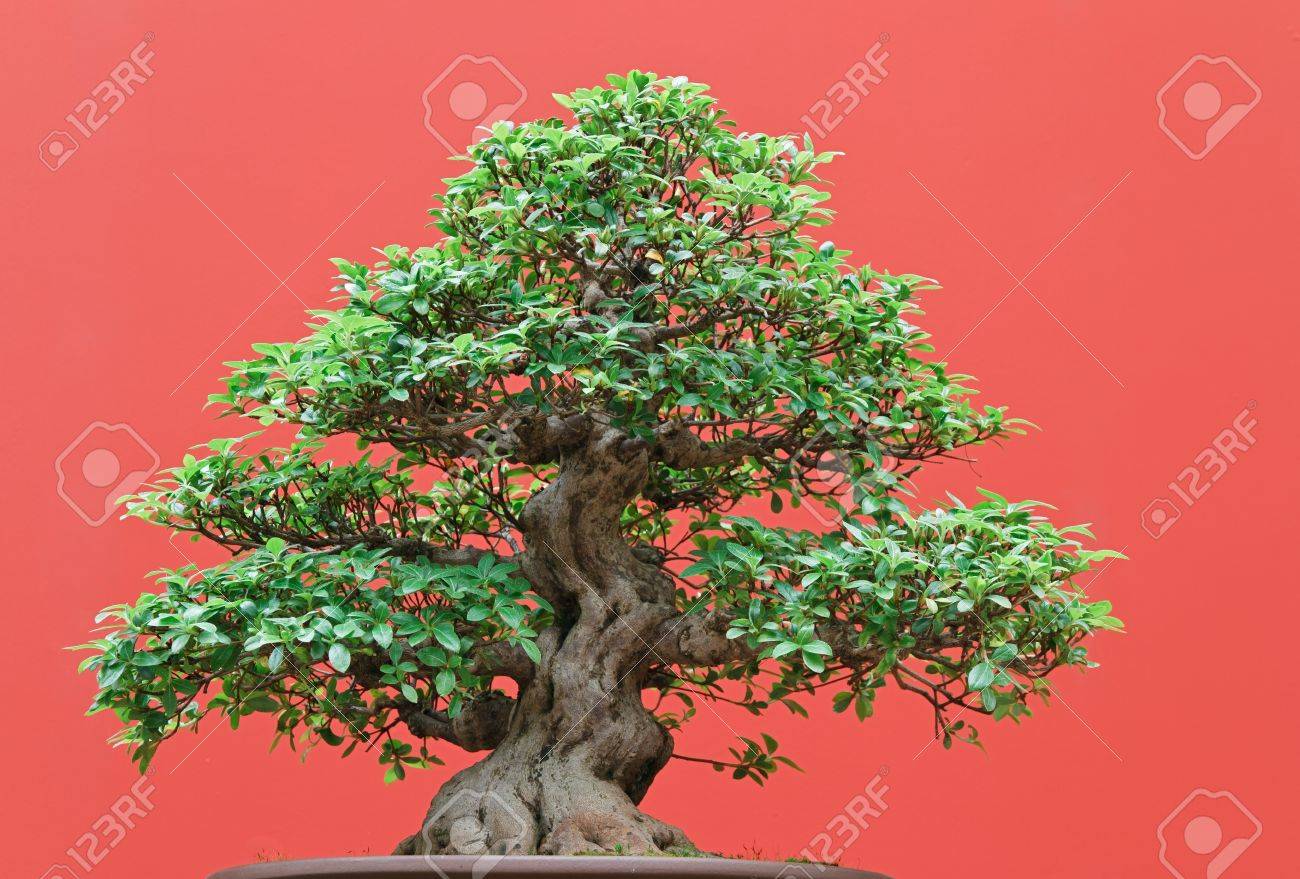 Ficus hermosos �rbol bonsai sobre fondo rojo
