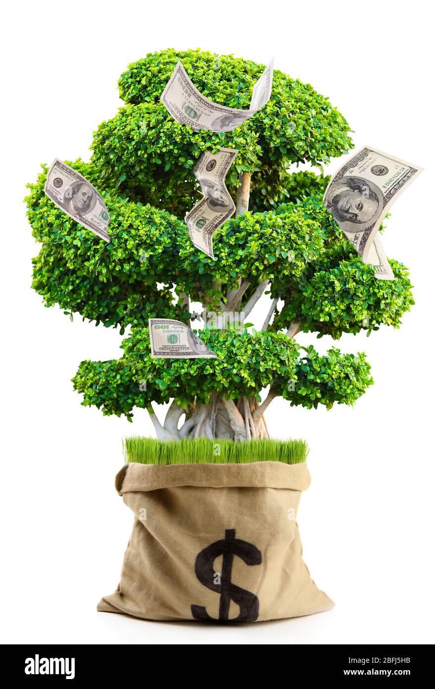 3d árbol de dinero con billetes de dólar. Aislado en el fondo blanco
