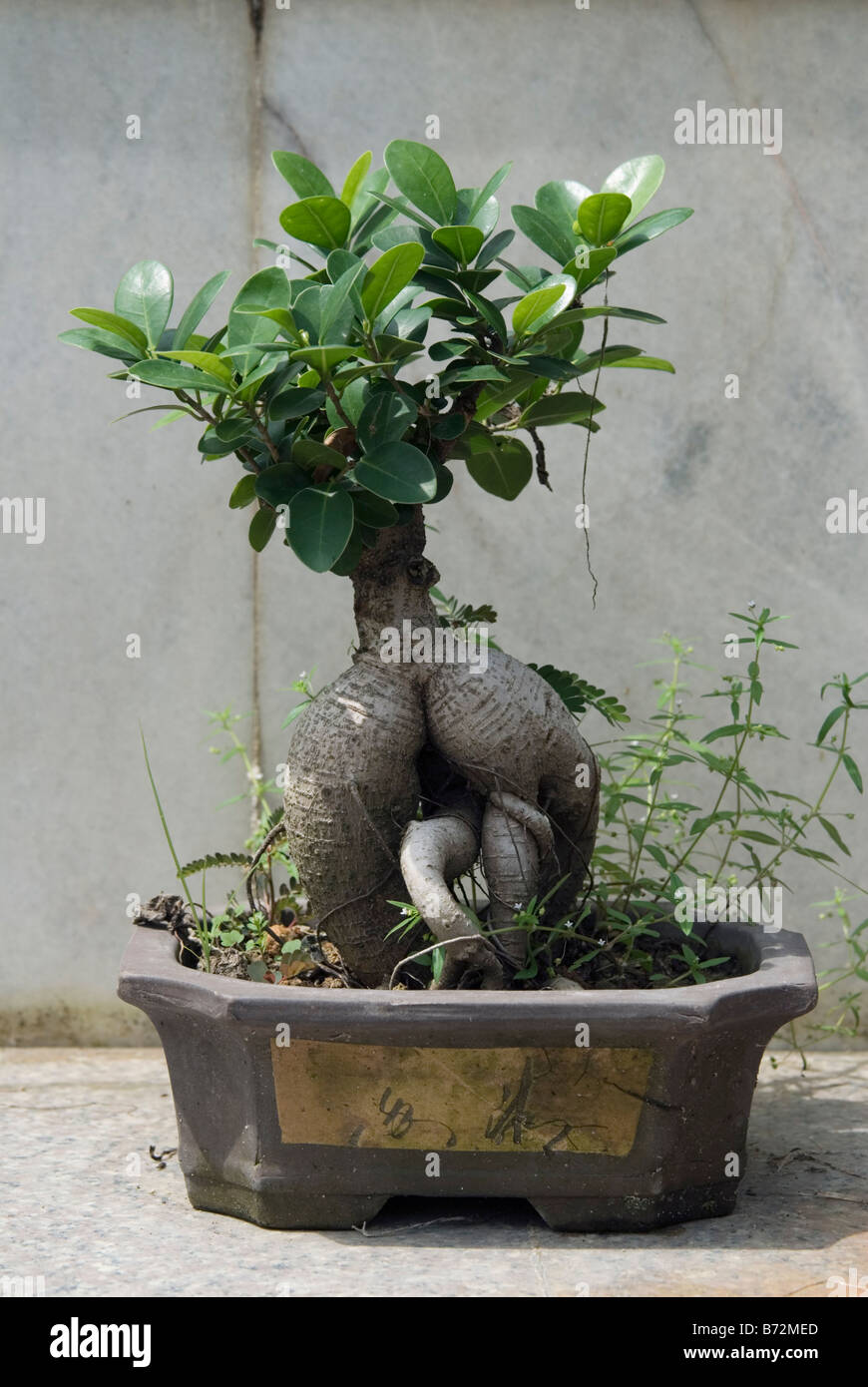 Bonsai tree with bulbous roots in a container at the Buddhist Kek